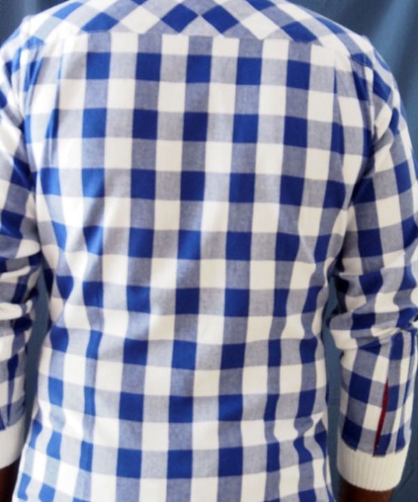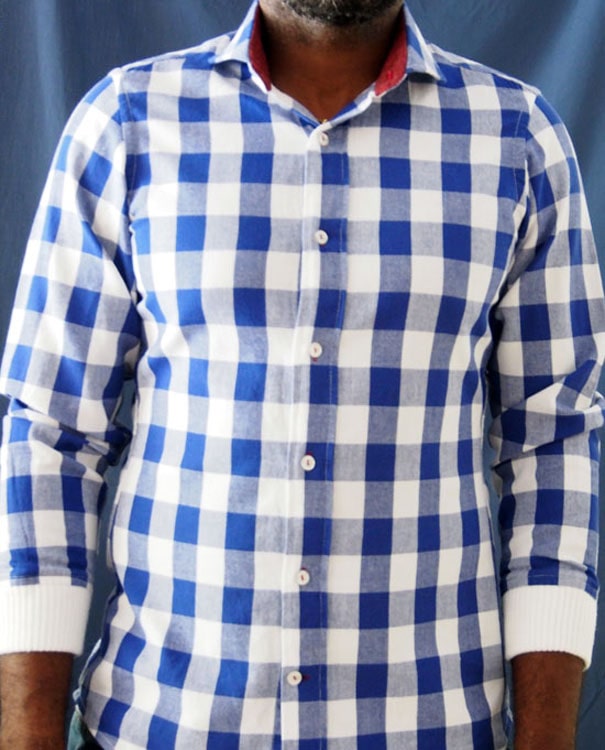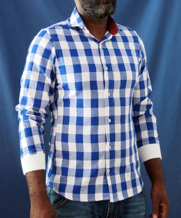Men tailored fit Long sleeve 1/2 blue gingham shirt with contrast reddish colour inner collar band.
